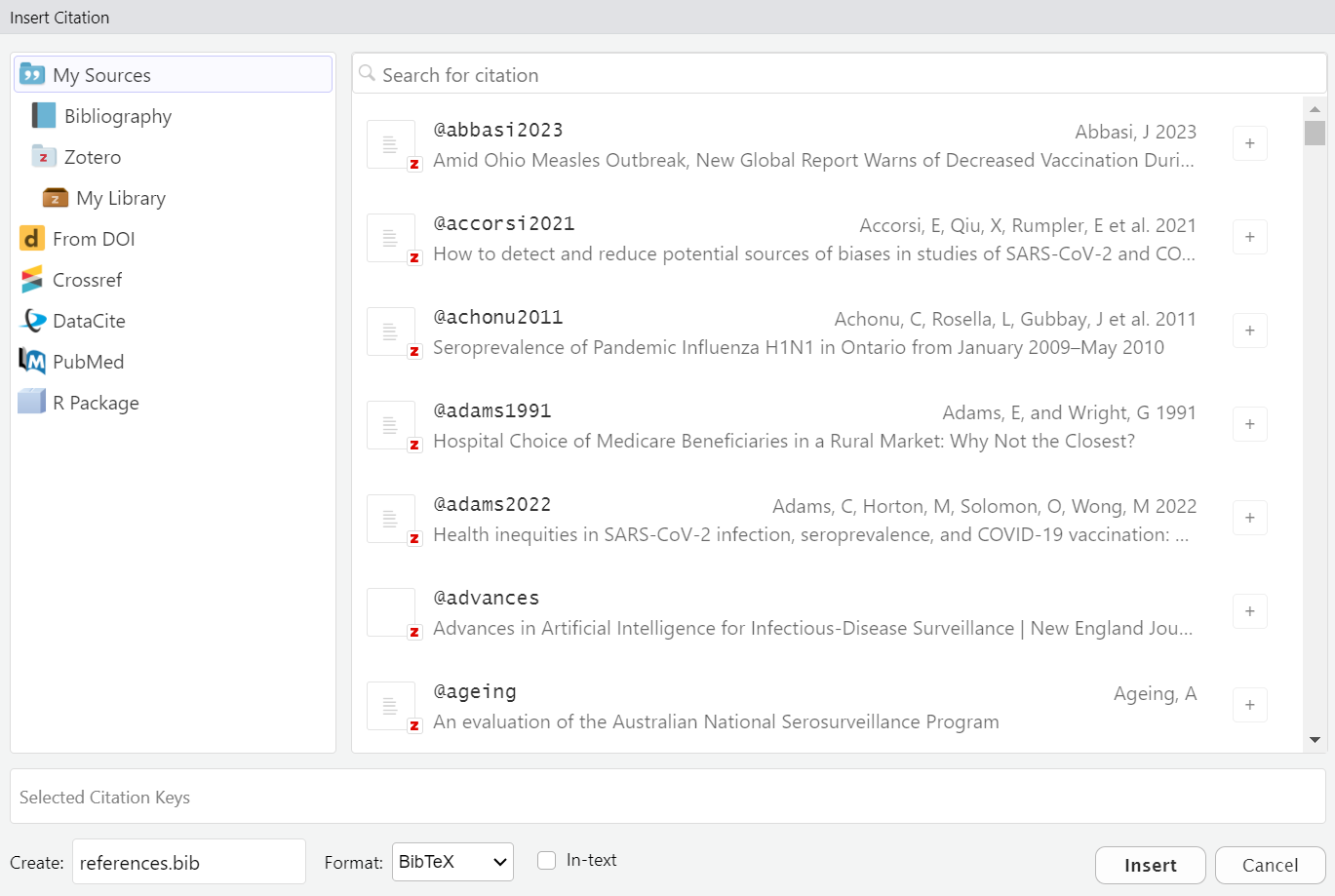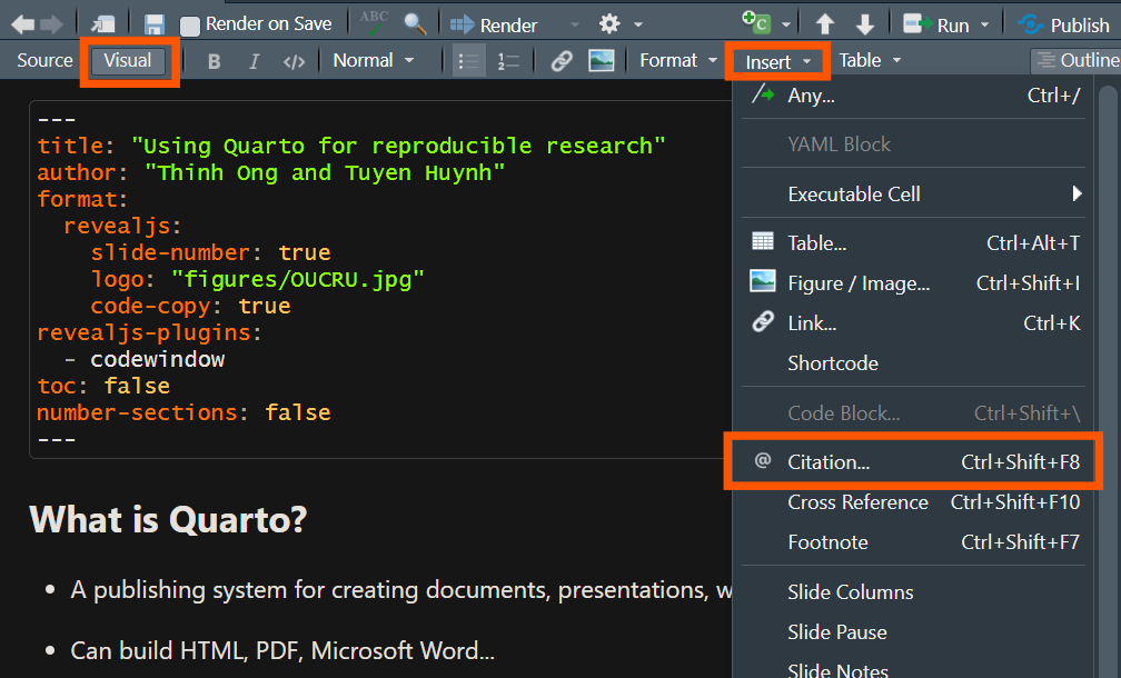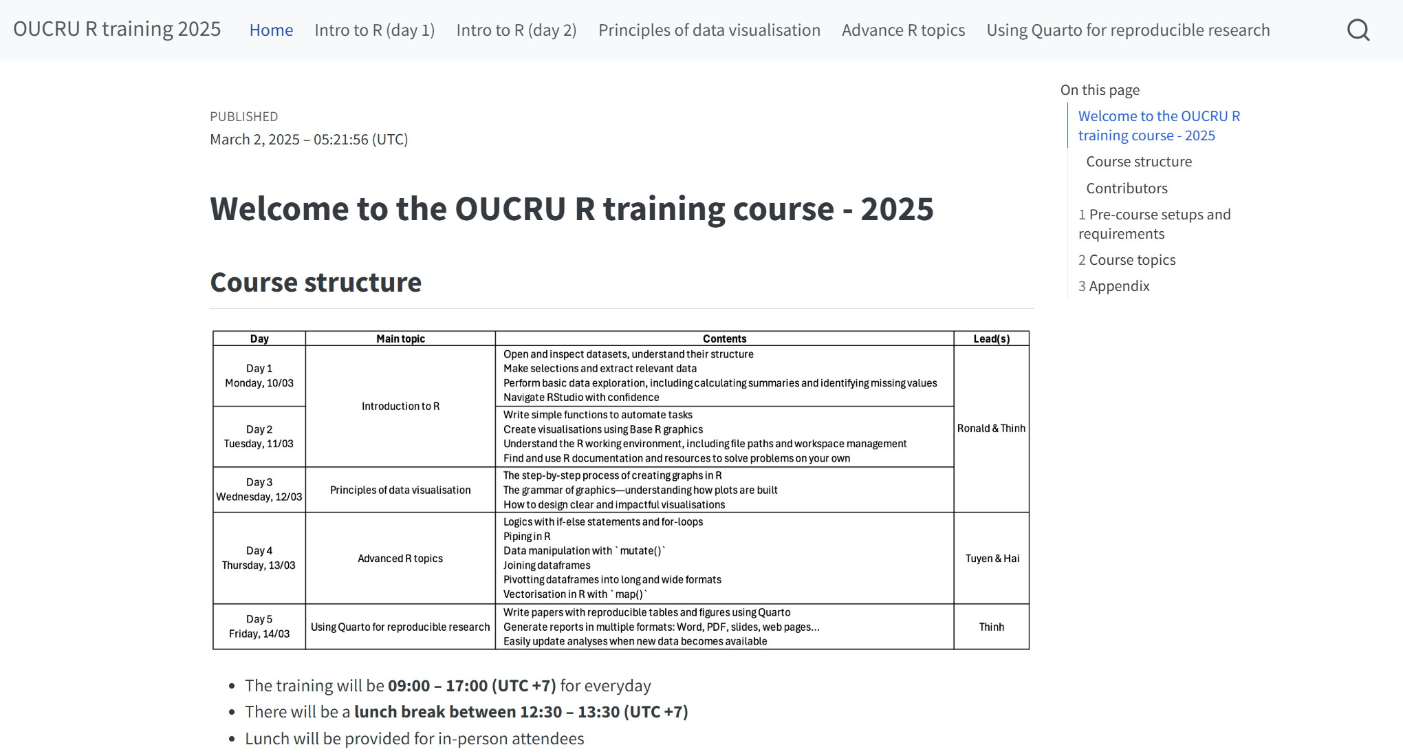 ---title: "Hello, Quarto"date: 2025-01-06author: "Biostats and Modelling"format: html: code-overflow: wrap embed-resources: truenumber-sections: truenavbar: falsetoc: false---## Introduction to QuartoQuarto is a publishing system that allows you to create documents, presentations, websites, and more using Markdown syntax and additional tools. ## Header LevelsQuarto supports multiple header levels to create a hierarchical structure in your document. For example:- Level 1 header: `# Header`- Level 2 header: `## Subheader`- Level 3 header: `### Sub-subheader`### Nested HeadersUsing headers, you can create nested sections to structure your document in a clear and organized way.## Inline Text FormattingYou can format your text inline to add emphasis or other styling options.- **Bold text**: `**bold**`- *Italic text*: `*italic*`- Inline `code`: `` `code` ``- [Underline]{.underline}: `[underline]{.underline}`> Blockquotes can be used to highlight important information or quotes by adding `> ` at the beginning of a line.## ListsQuarto supports both ordered and unordered lists.### Unordered ListTo create an unordered list, use an asterisk `*` before each item:* First item* Second item* Third item### Ordered ListTo create an ordered list, use numbers before each item:1. First item2. Second item3. Third item## Links and images<http://example.com>[linked phrase](http://example.com)## Tables| First Header | Second Header ||--------------|---------------|| Content Cell | Content Cell || Content Cell | Content Cell |## Code blockQuarto also supports code blocks, making it easy to include and execute code within your document. Here’s an example of a code block to create a simple plot using R:```{r}#| fig-width: 4#| fig-height: 3#| out-width: "100%"x <- c(1, 2, 3, 4, 5)y <- c(1, 4, 9, 16, 25)plot(x, y, type = "o", col = "blue", main = "Simple plot", xlab = "x", ylab = "y")```## FootnotesFootnotes can be added inline to provide additional information or references. Here's an example of a footnote in Quarto: ^[This is an example footnote.]