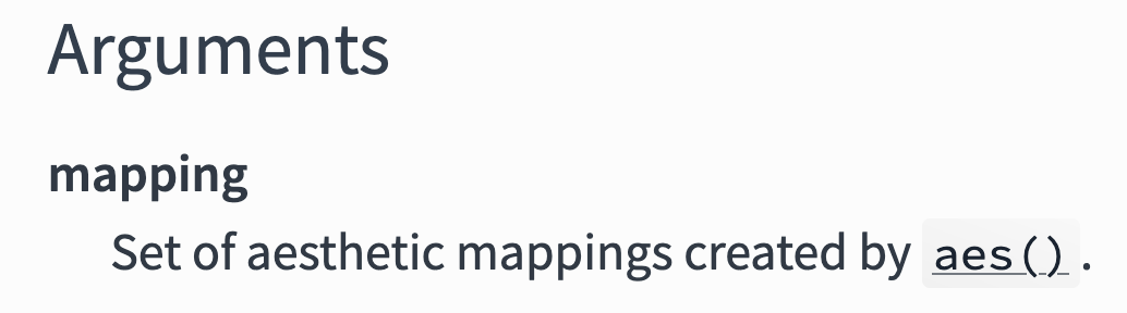 Aesthetic attributes: “role” of variables in plot: location (often along x-axis and y-axis), colour, size, shape