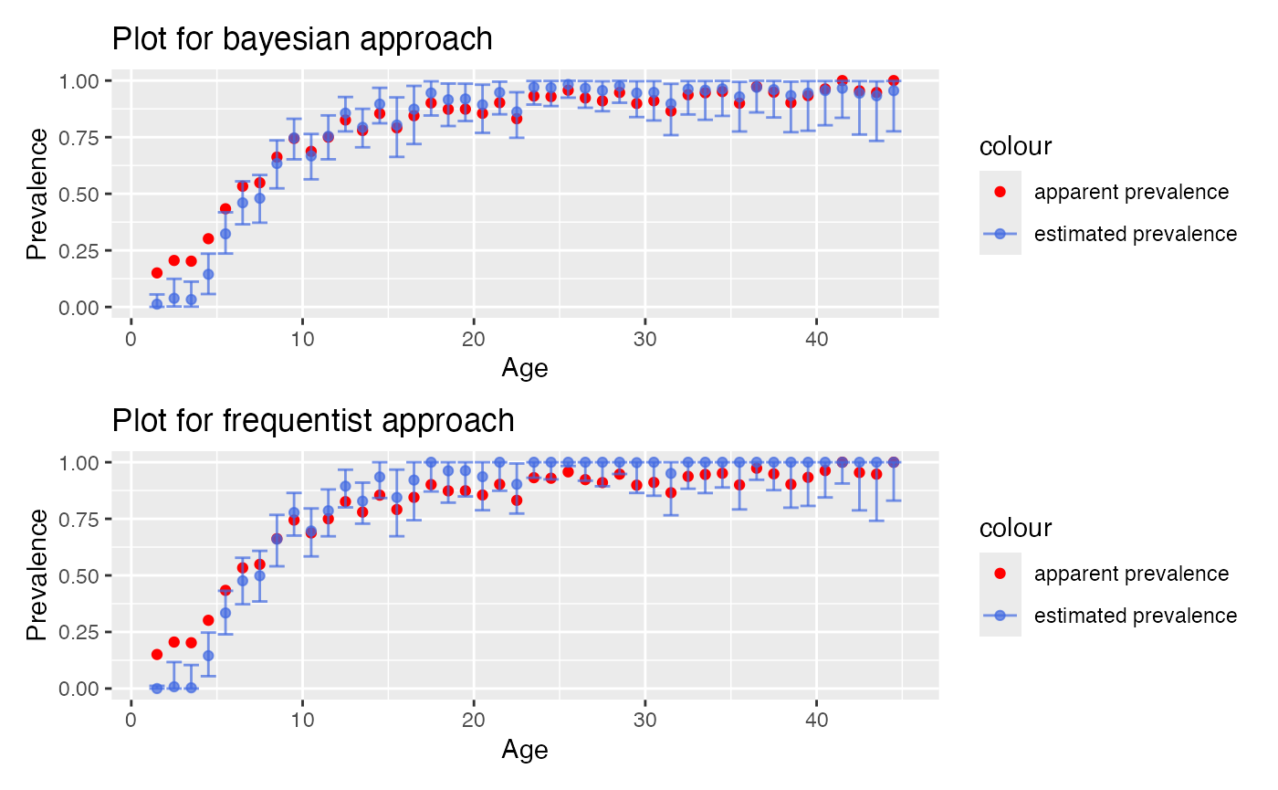 bayesianwhether to adjust sero-prevalence using the Bayesian or frequentist approach. If set toTRUE, true sero-prevalence is estimated using MCMC.init_sesensitivity of the serological test (default value0.95)init_spspecificity of the serological test (default value0.8)study_size_se(applicable whenbayesian=TRUE) sample size for sensitivity validation study (default value1000)study_size_sp(applicable whenbayesian=TRUE) sample size for specificity validation study (default value1000)chains(applicable whenbayesian=TRUE) number of Markov chains (default to1)warmup(applicable whenbayesian=TRUE) number of warm up runs (default value1000)iter(applicable whenbayesian=TRUE) number of iterations (default value2000)