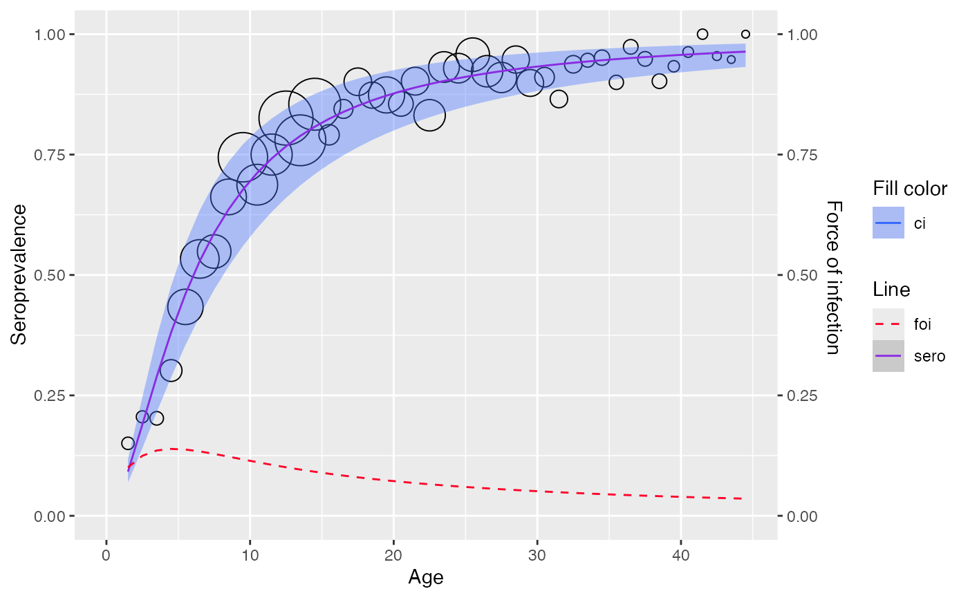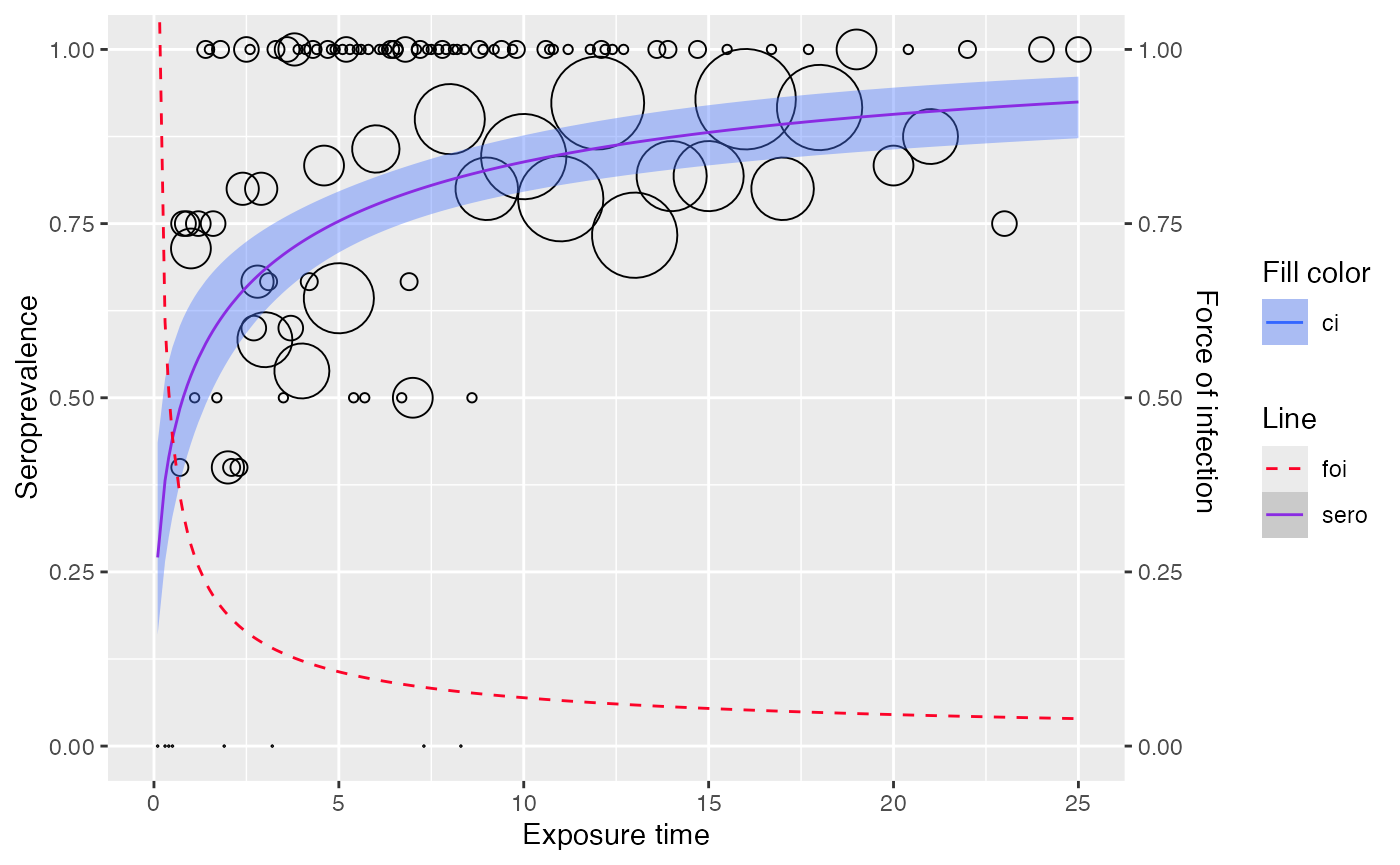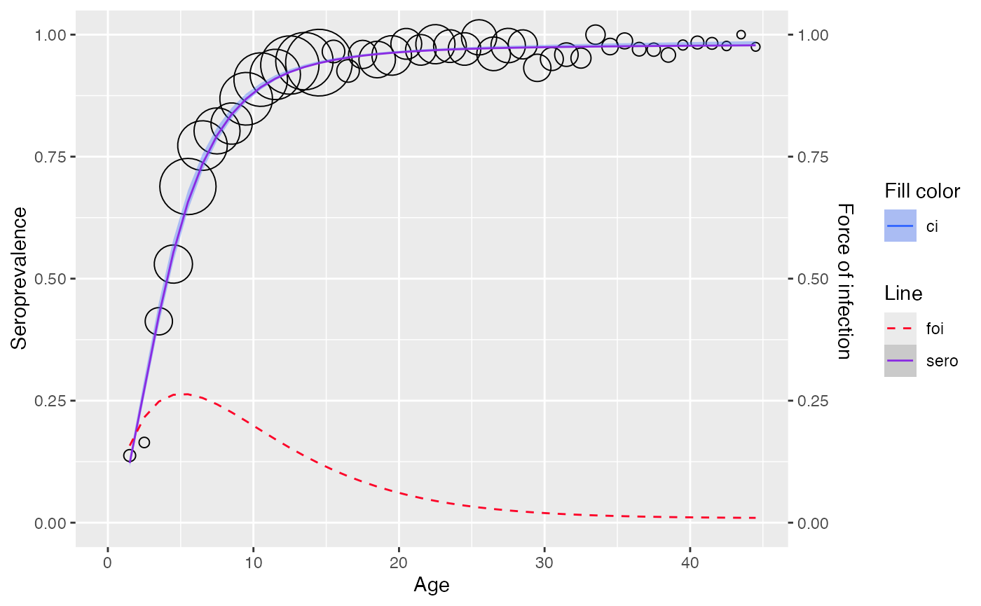 Seroprevalence is modeled using the following serocatalytic model