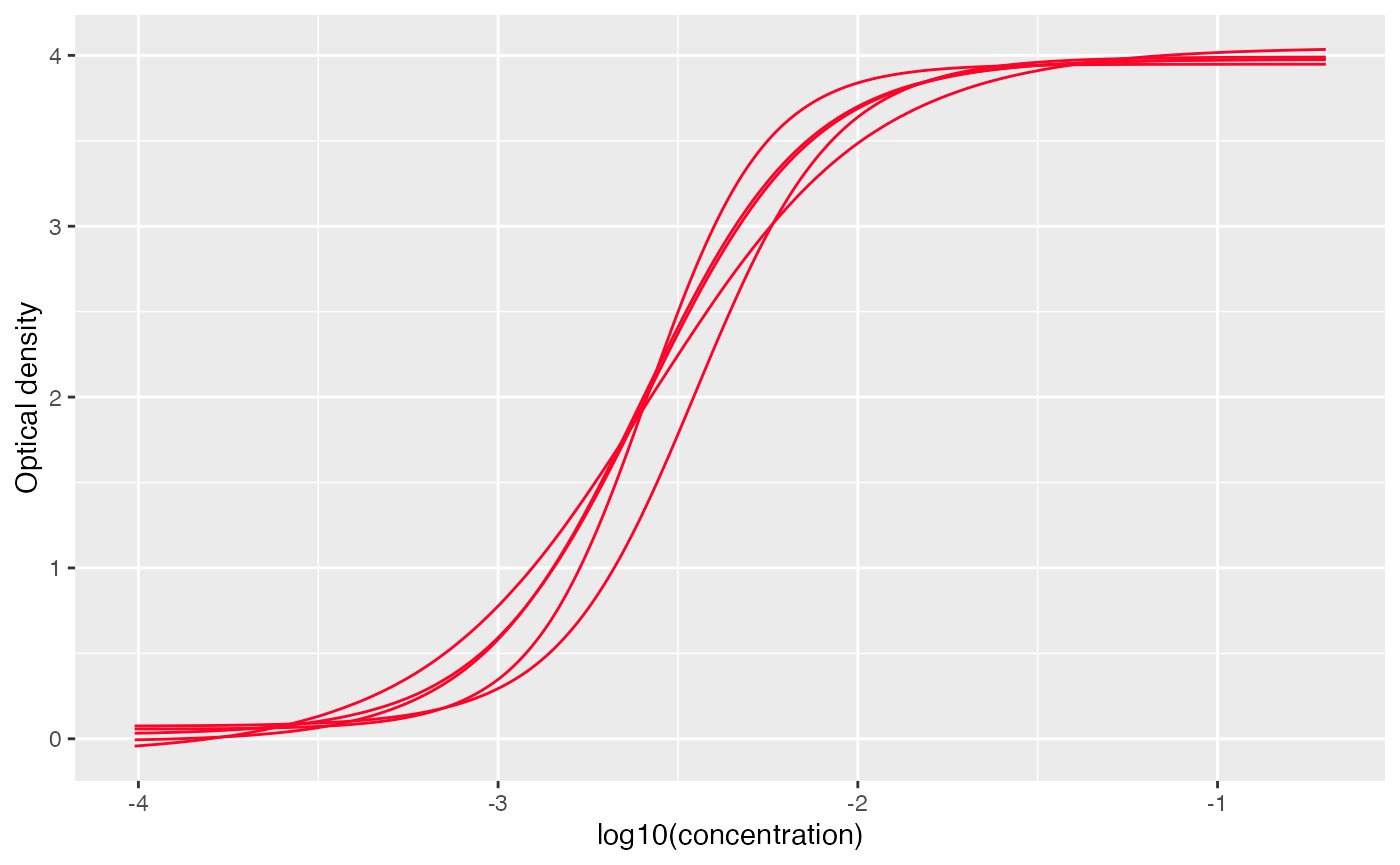 # 4PL function: OD = D + (A - D) / (1 + 10^((log10(conc) - c) * b))