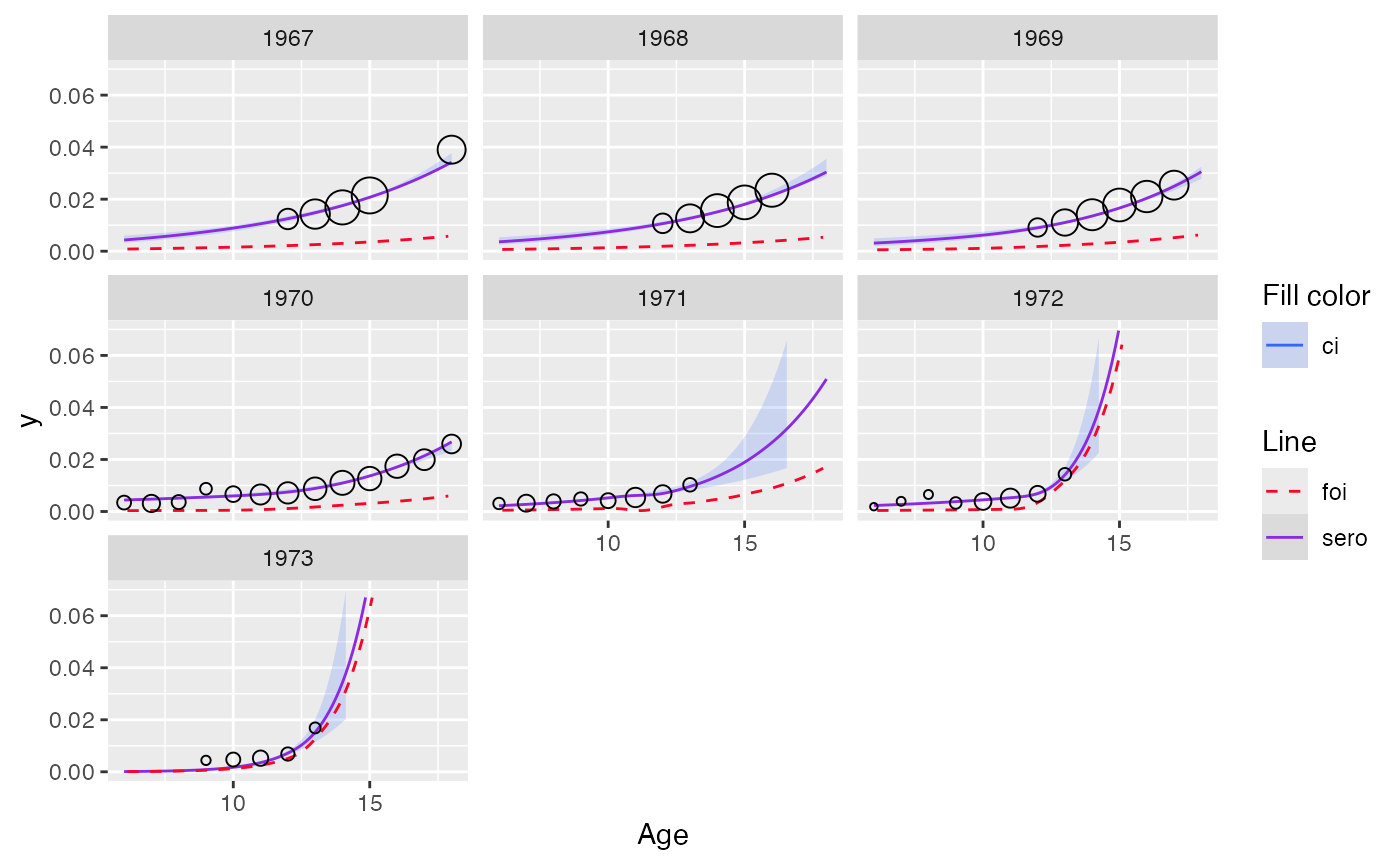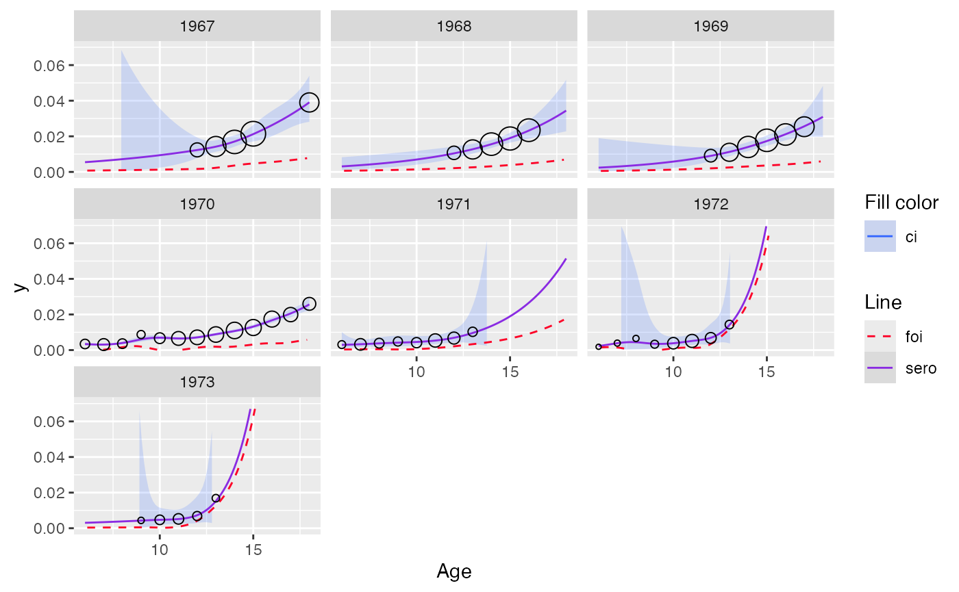 age_correct = FALSE)Or birth cohort specific seroprevalence over time (